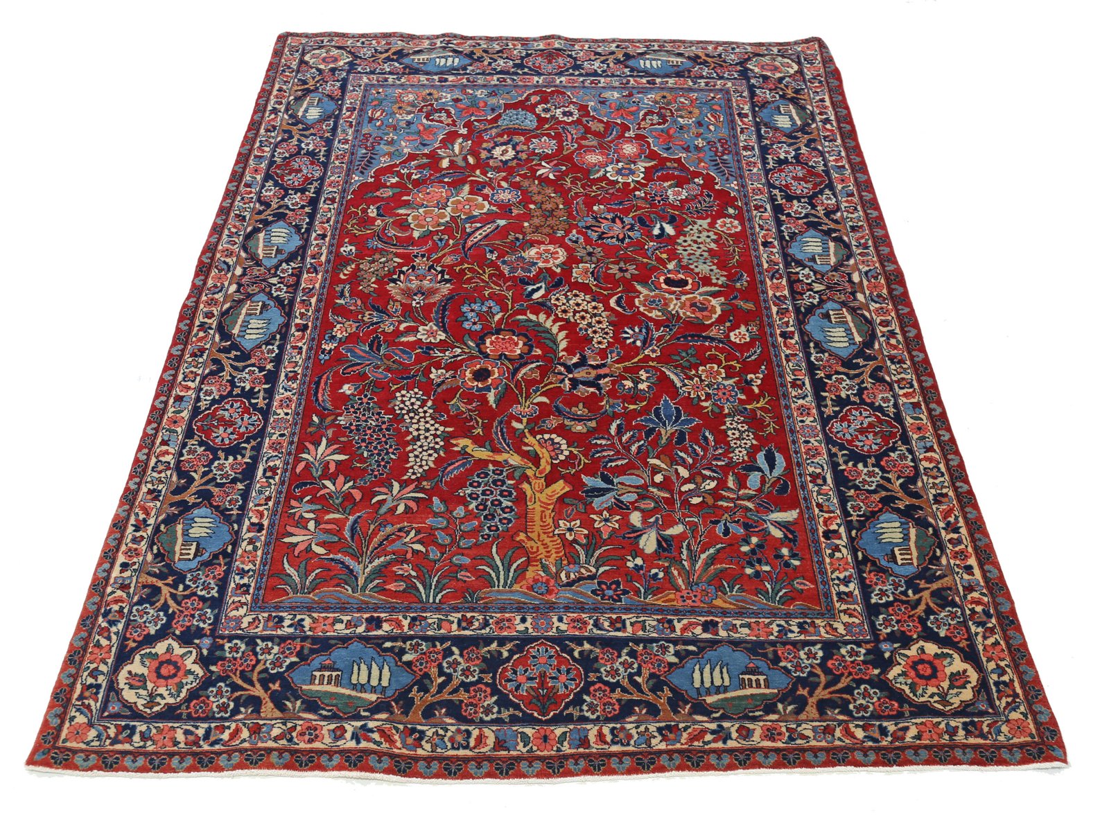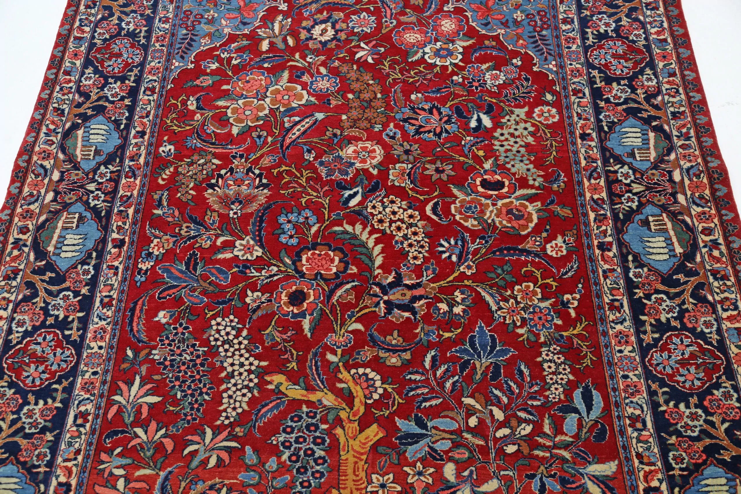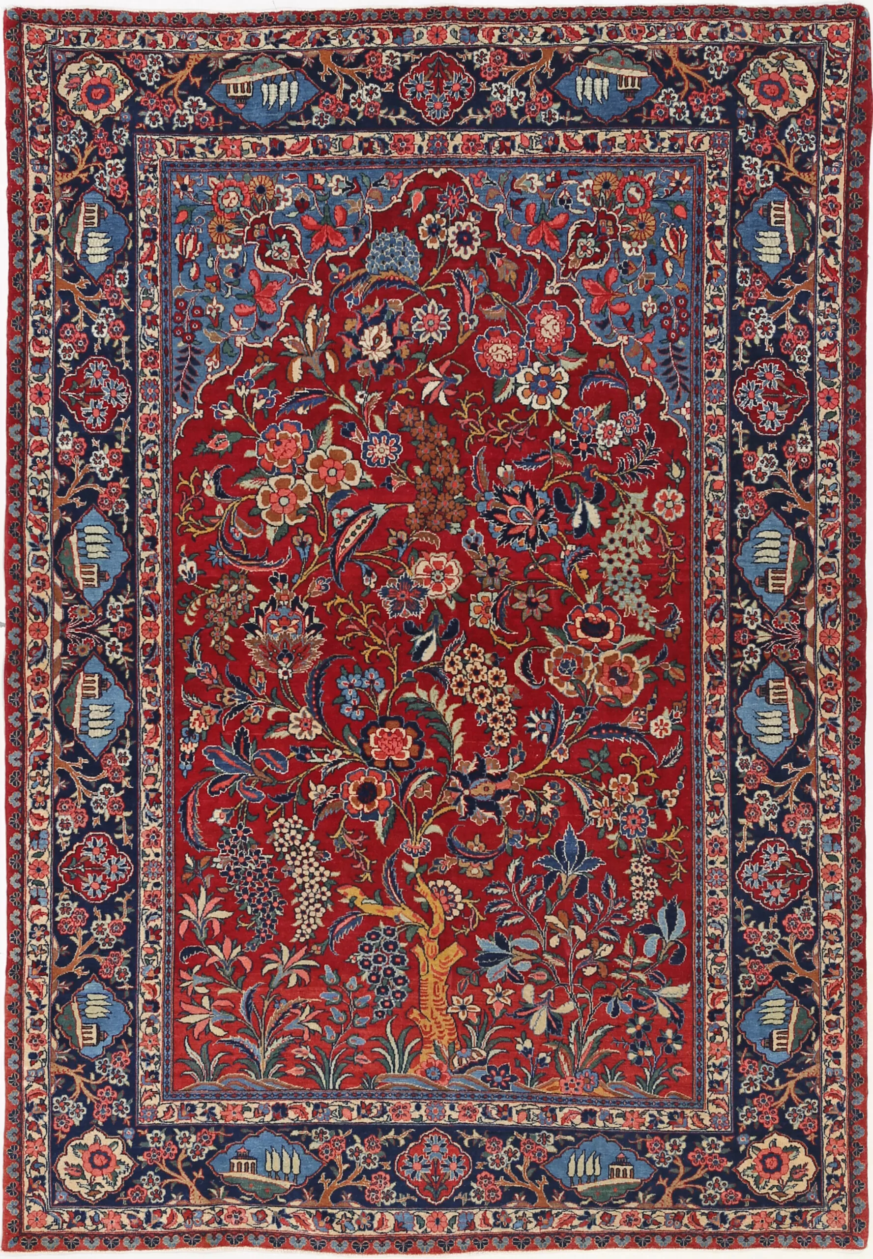 The palette demonstrates the mastery of natural dyeing achieved by Kashan weavers: a deep, saturated crimson red field contrasts magnificently with the navy blue border. The pavilion cartouches glow in soft sky blue, while the abundant florals display cream, burnt orange, coral pink, sage green, golden yellow, and soft brown. Over a century of aging has mellowed these colors to a beautiful antique patina while preserving remarkable depth and vibrancy.