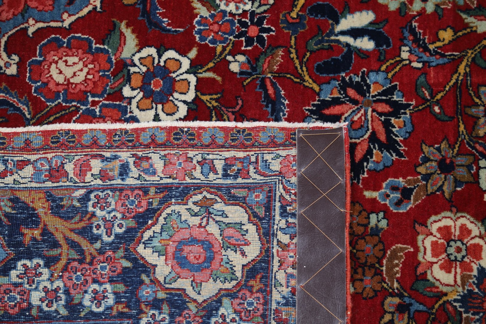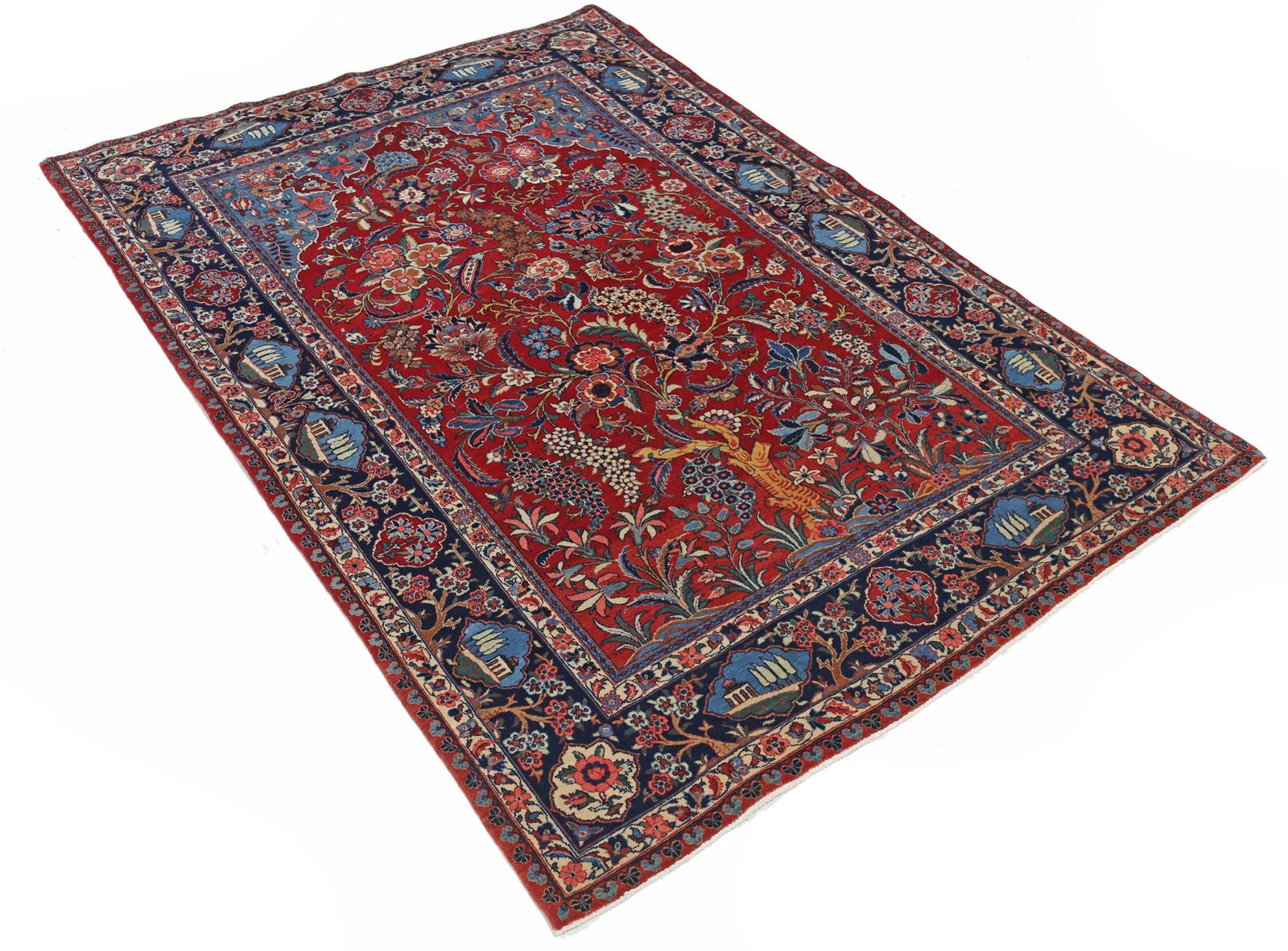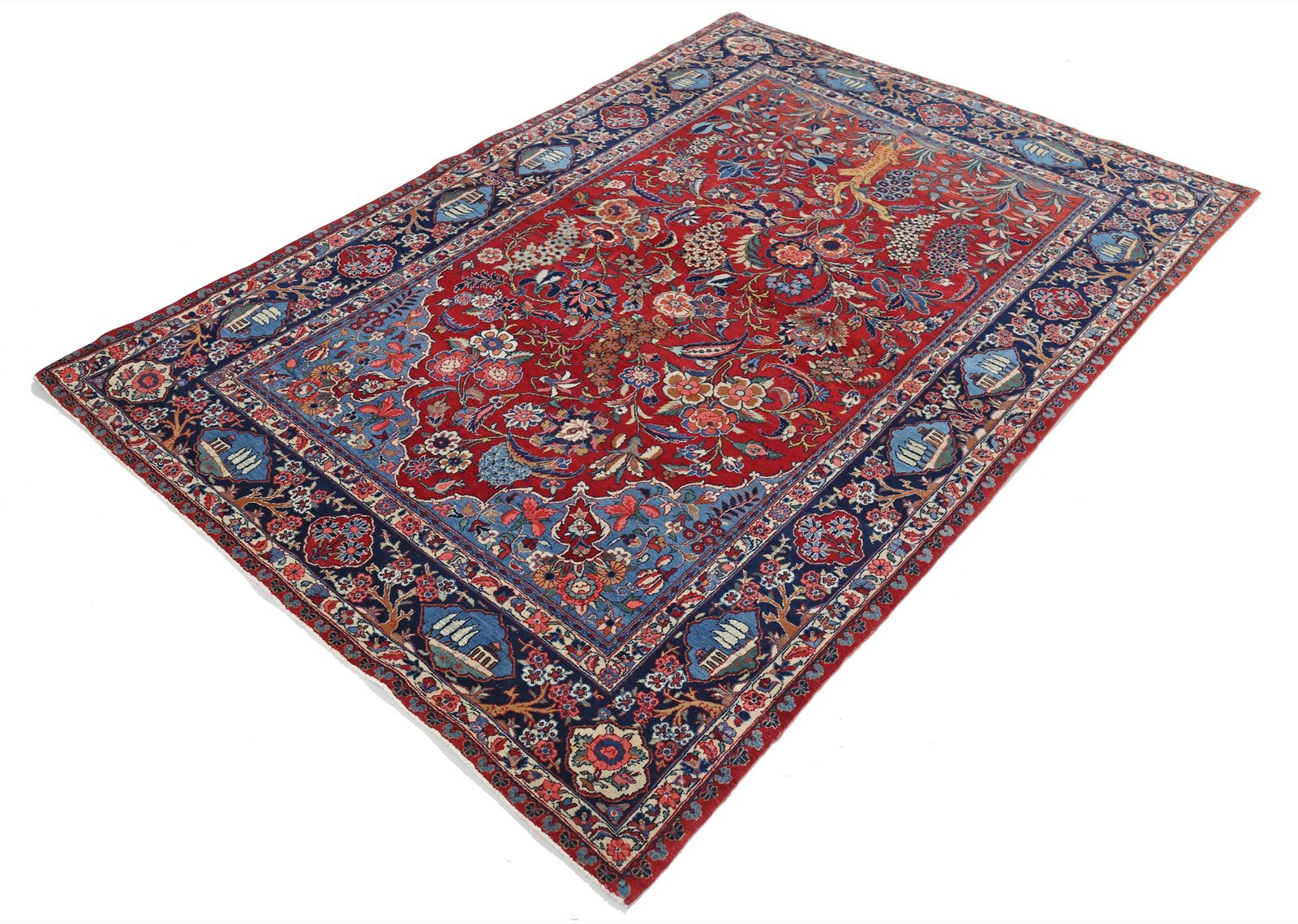 The palette demonstrates the mastery of natural dyeing achieved by Kashan weavers: a deep, saturated crimson red field contrasts magnificently with the navy blue border. The pavilion cartouches glow in soft sky blue, while the abundant florals display cream, burnt orange, coral pink, sage green, golden yellow, and soft brown. Over a century of aging has mellowed these colors to a beautiful antique patina while preserving remarkable depth and vibrancy.