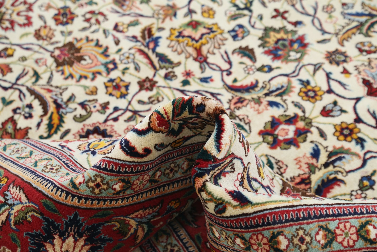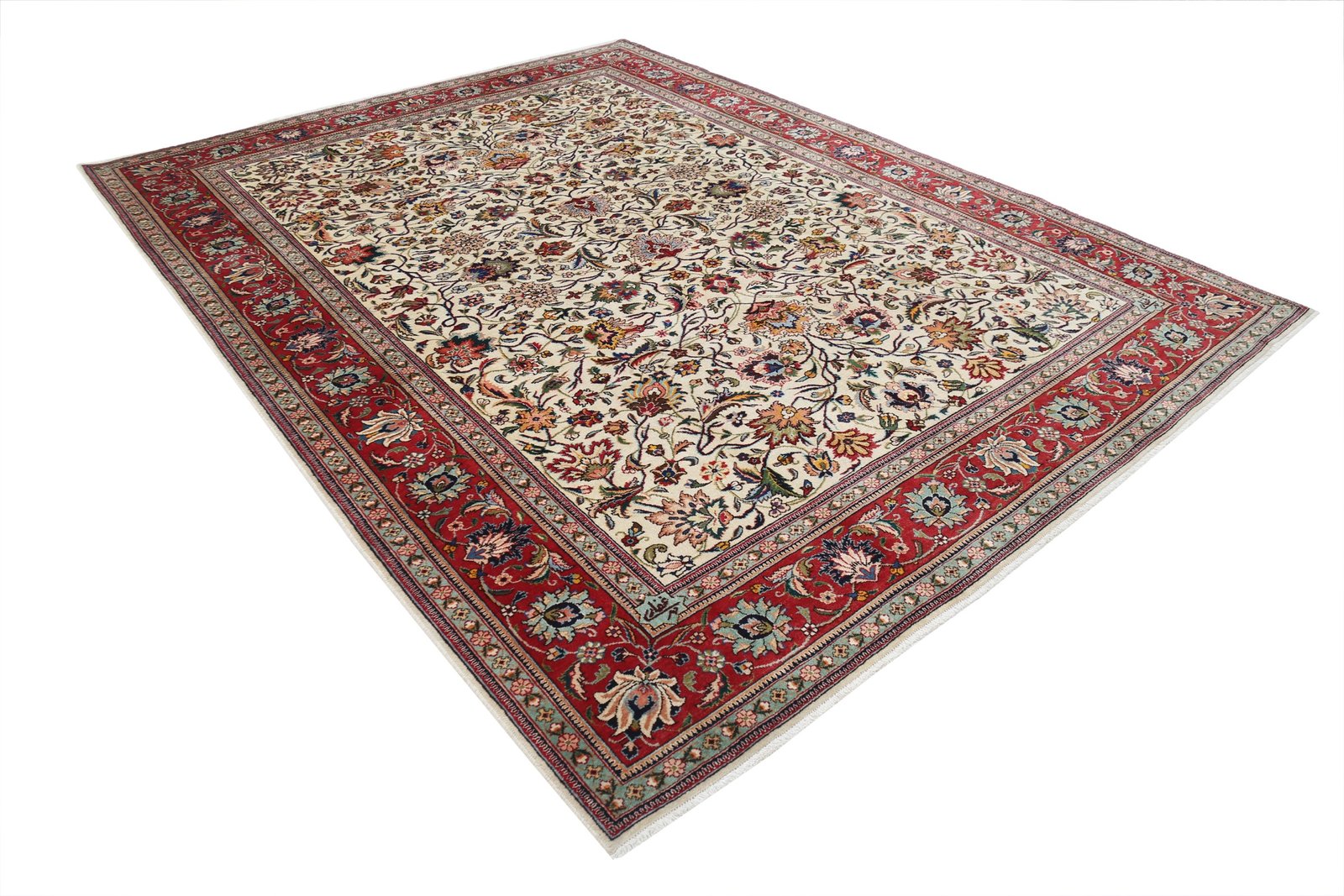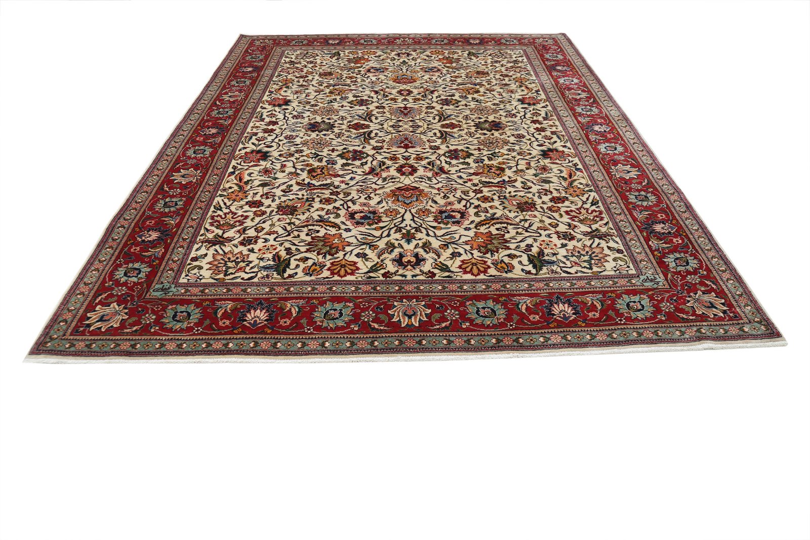 Rather than a central medallion, this Tabriz presents an enchanting all-over garden design—an abundant tapestry of botanical forms that transforms the rug into a flowering paradise. Graceful curving vines meander across the luminous ivory field, bearing an extraordinary variety of blossoms: elaborate palmettes, lotus flowers, carnations, rosettes, and delicate leaf sprays. Each flower is rendered with remarkable detail and individuality, creating visual depth that rewards close inspection.