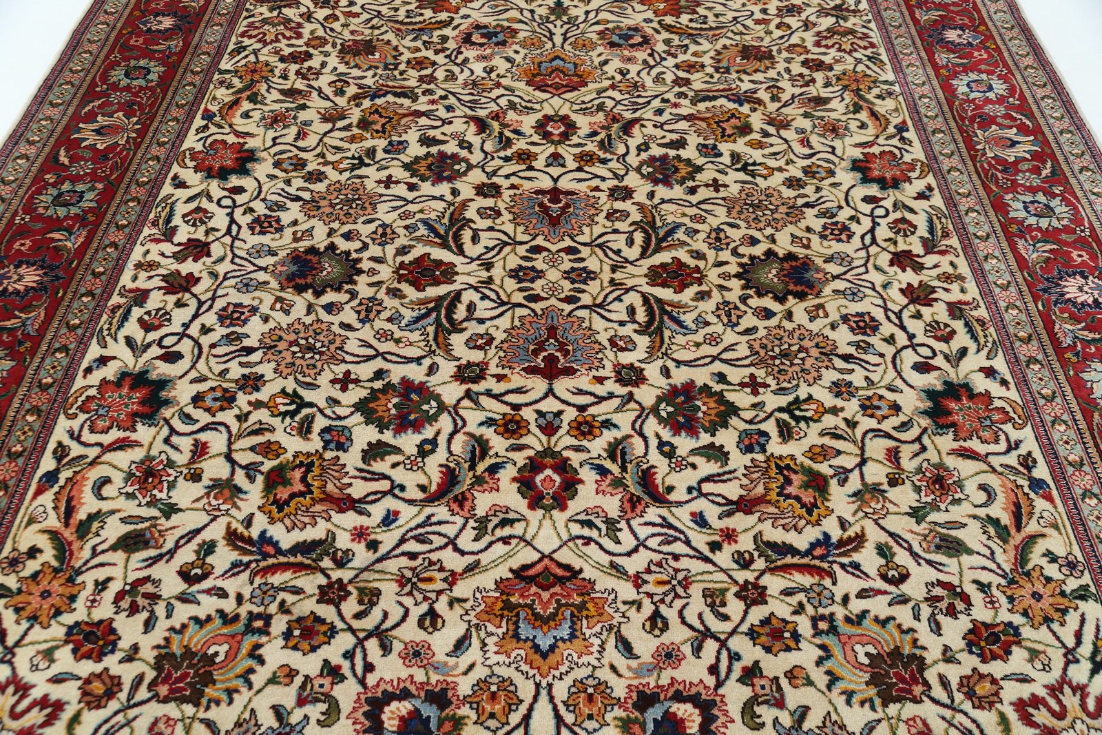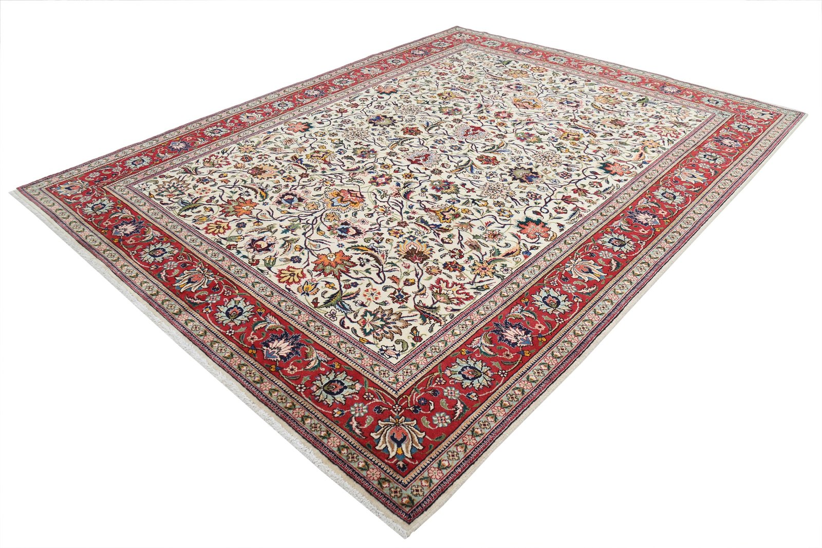 Signed Persian Tabriz Rug | Meh Ghafari All-Over Floral 8′ x 10’6″ | Ivory Field & Red Border
