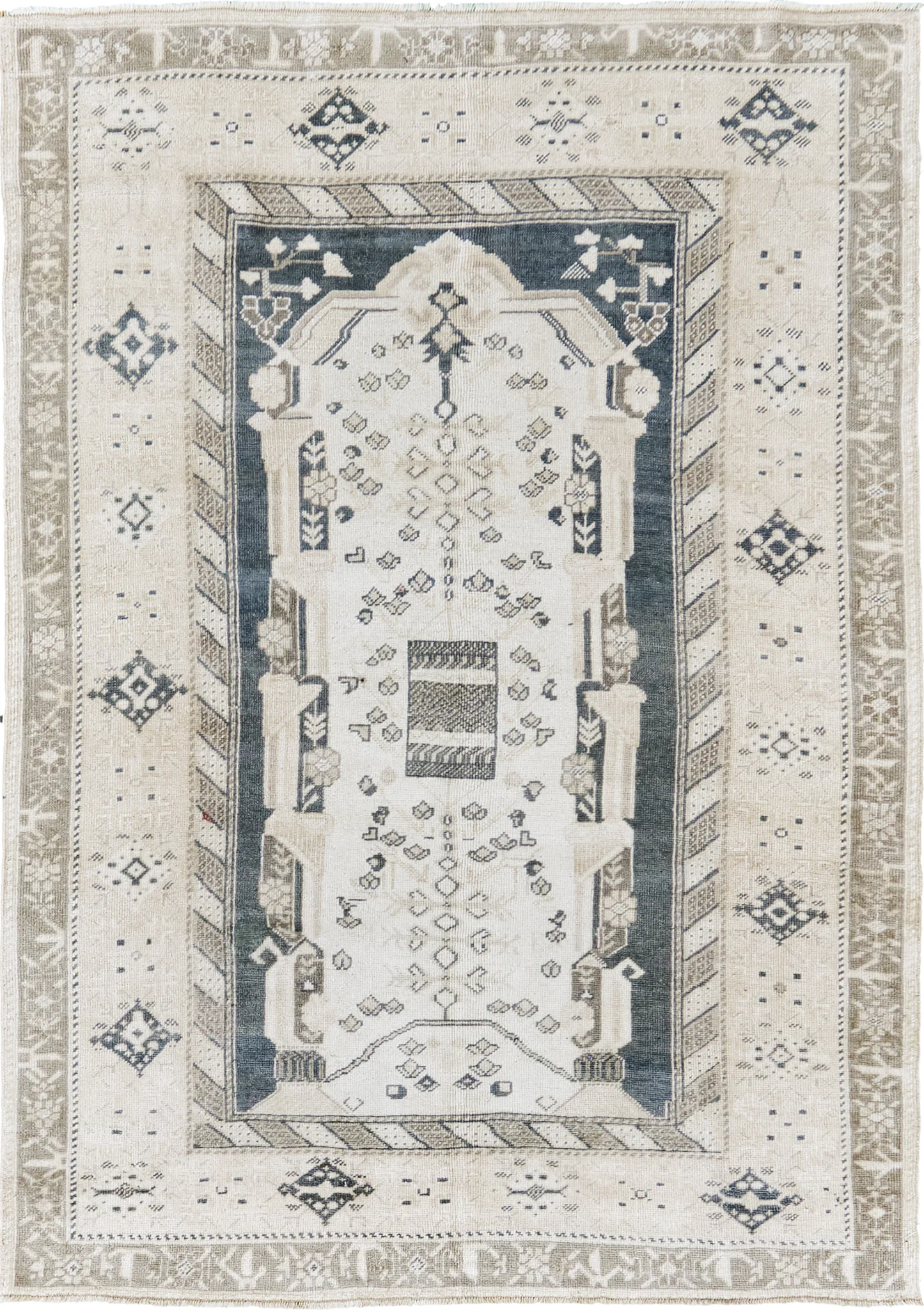 A sophisticated, muted palette defines this piece: a luminous ivory-cream field contrasts beautifully with deep steel blue accents that outline the mihrab and anchor the design. Warm taupe and soft grey tones in the borders and scattered motifs create harmony throughout. The colors have mellowed gracefully with age, achieving that coveted vintage softness prized by designers.